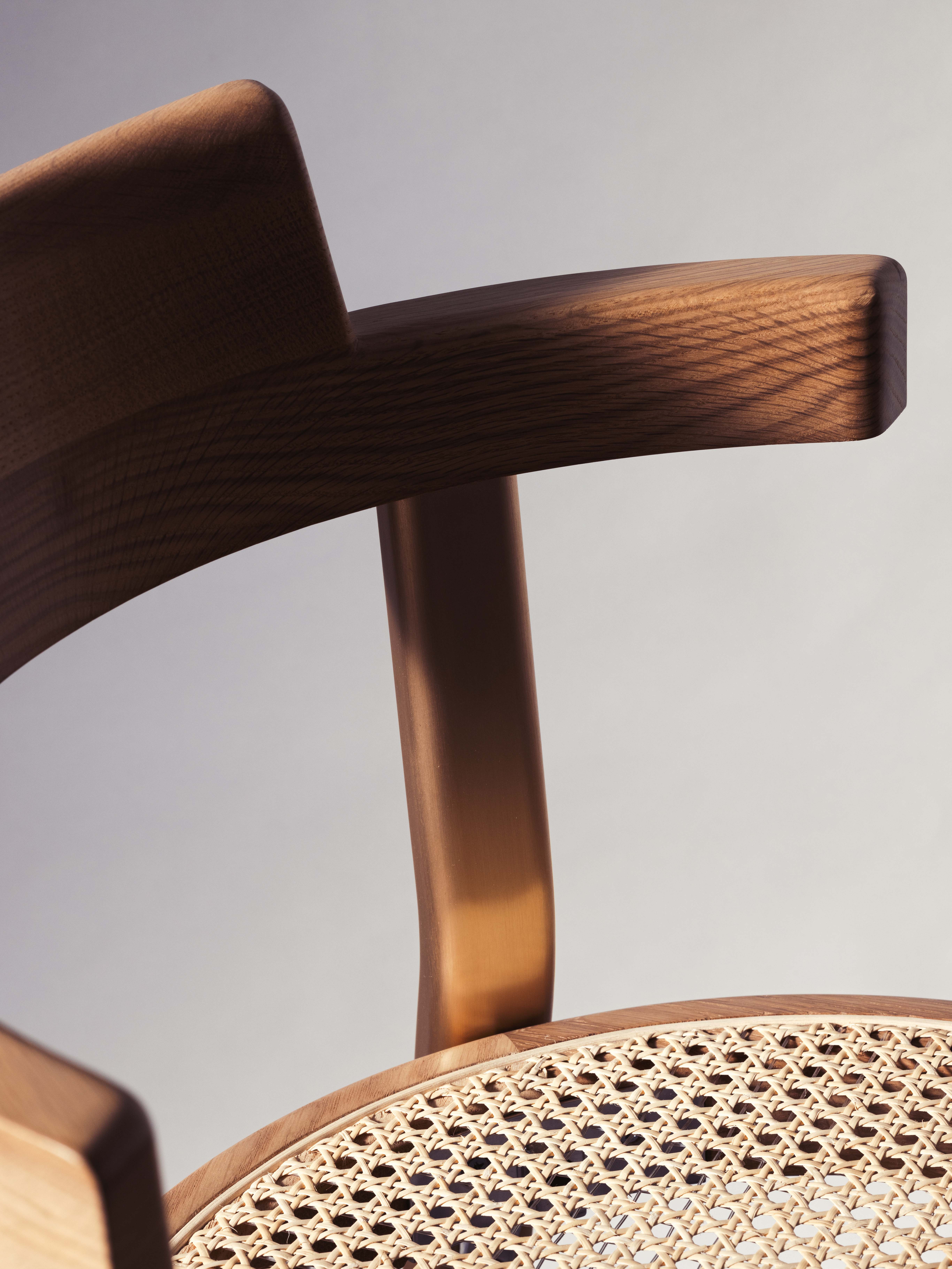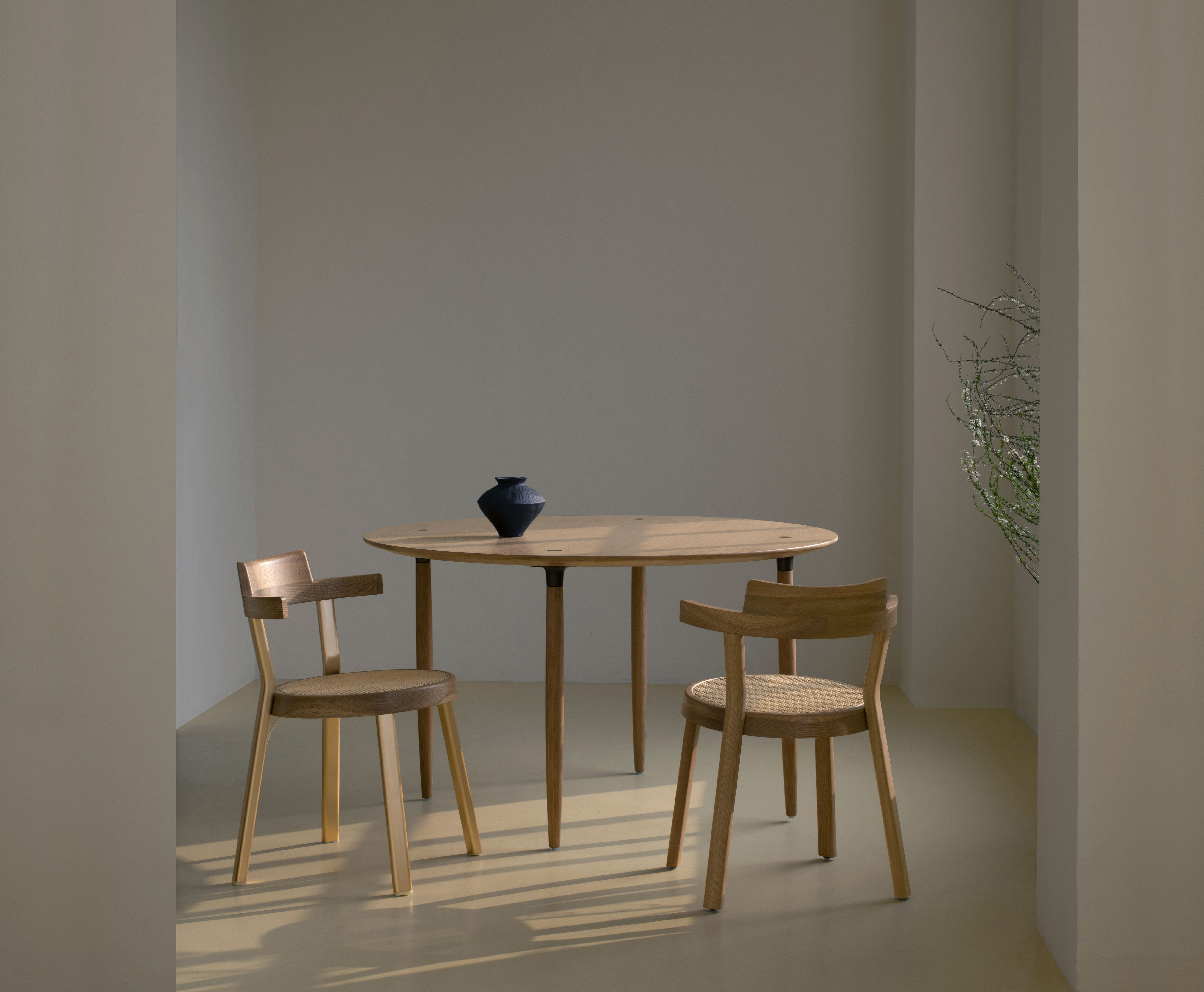 Pagoda餐椅系列,其灵感来自19世纪维也纳的经典咖啡椅。这把椅子极其轻巧,结构被简化到其本质上。通过优良的工艺与效率,及多种材料配置,使这把餐椅仅由六个部件所组成。餐椅的圆形椅座,象征着中国文化中的"自然之道"与"合而为一",合理化的表达座椅一体性。椅子的悬臂和背部设计,以传统建筑"佛塔(Pagoda gates)"为设计元素参考,增添座椅独特的性格,悬臂以半悬空式设计,消除对餐椅有无扶手的需求考量。