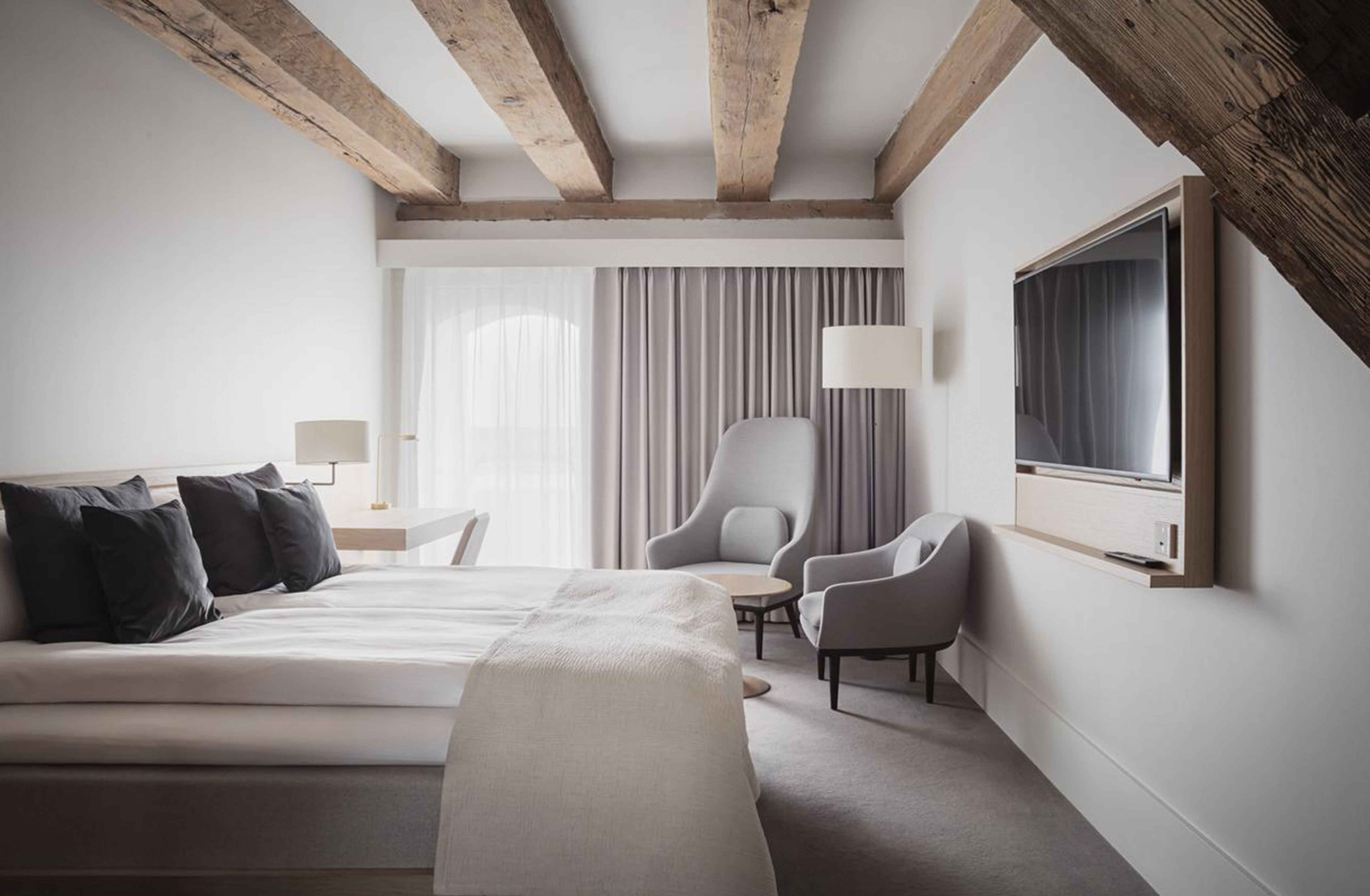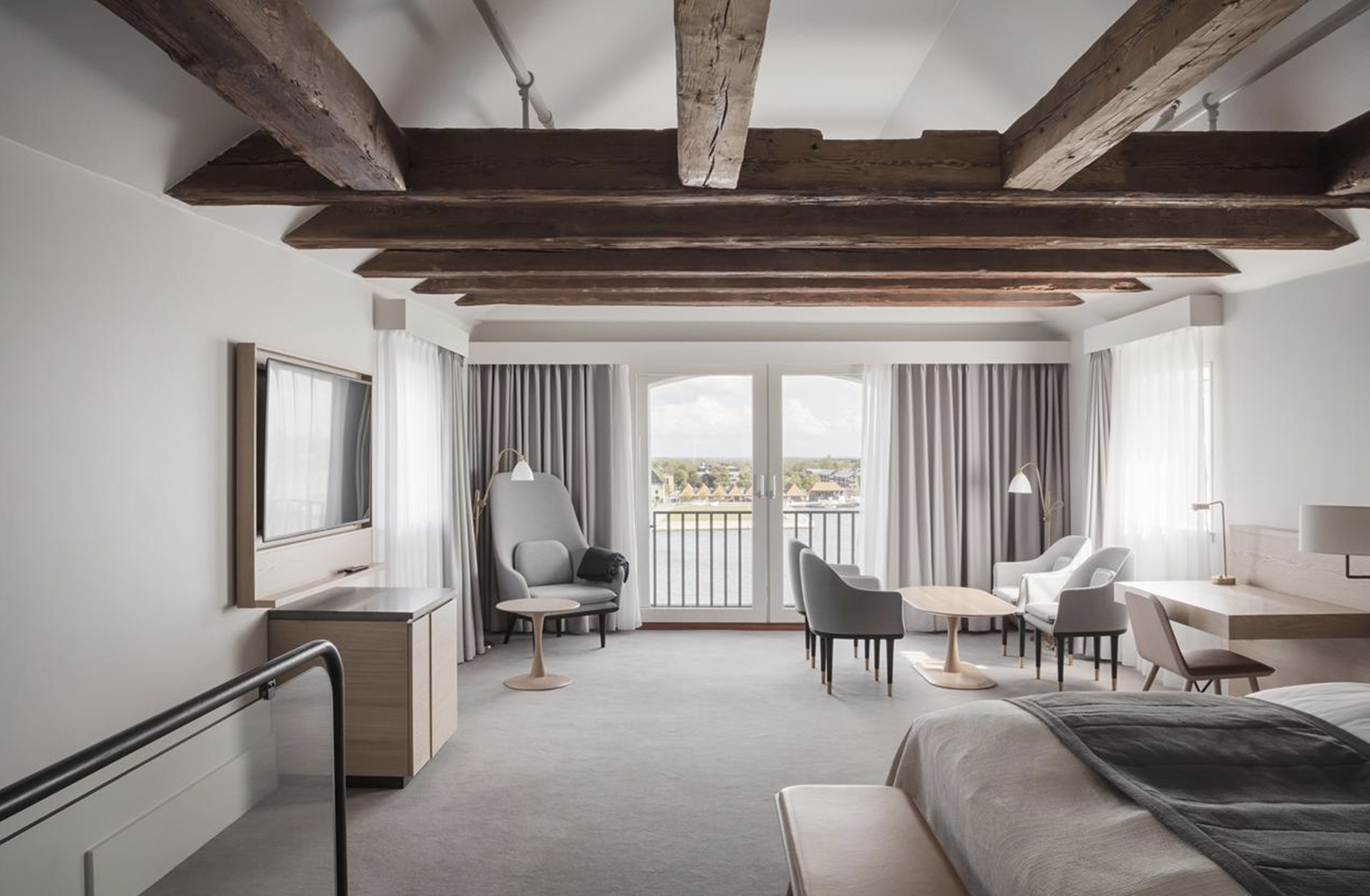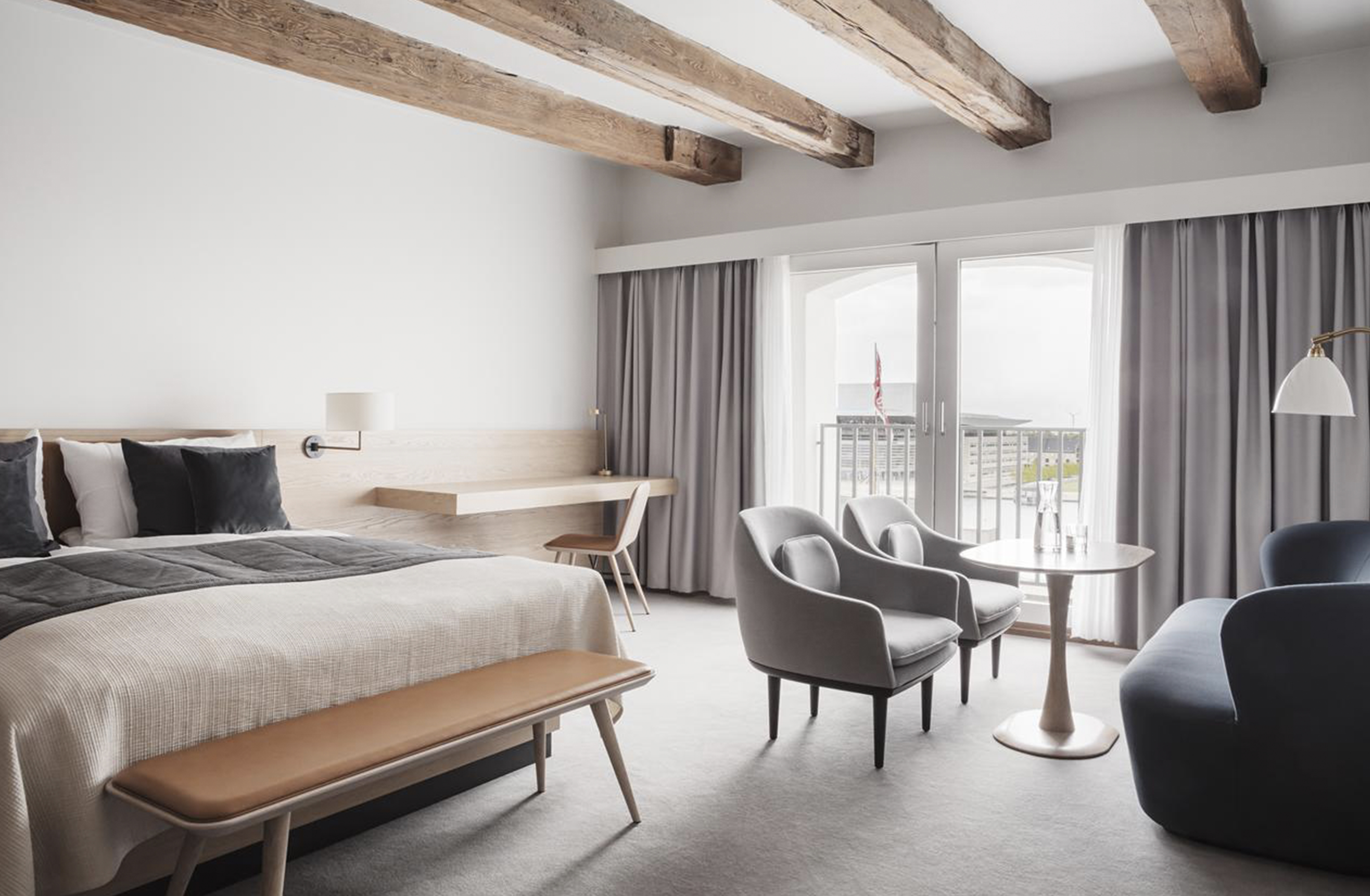 The interior renovation led by Space Copenhagen, reimagined all 366 guest rooms to reflect the principles of Scandinavian design. The interiors balance the cozy warmth of hygge with a refined touch. Exposed timber beams stretch across the ceilings, framing contemporary furnishings in a soft, muted color palette that defines the space as a tranquil retreat.